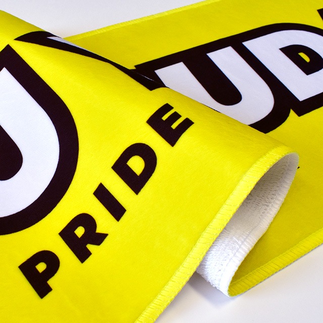 表面は遠くからでもデザインが綺麗に映えるポリエステル生地、裏面は吸水性のあるコットン生地となっておりますので実用性も十分。