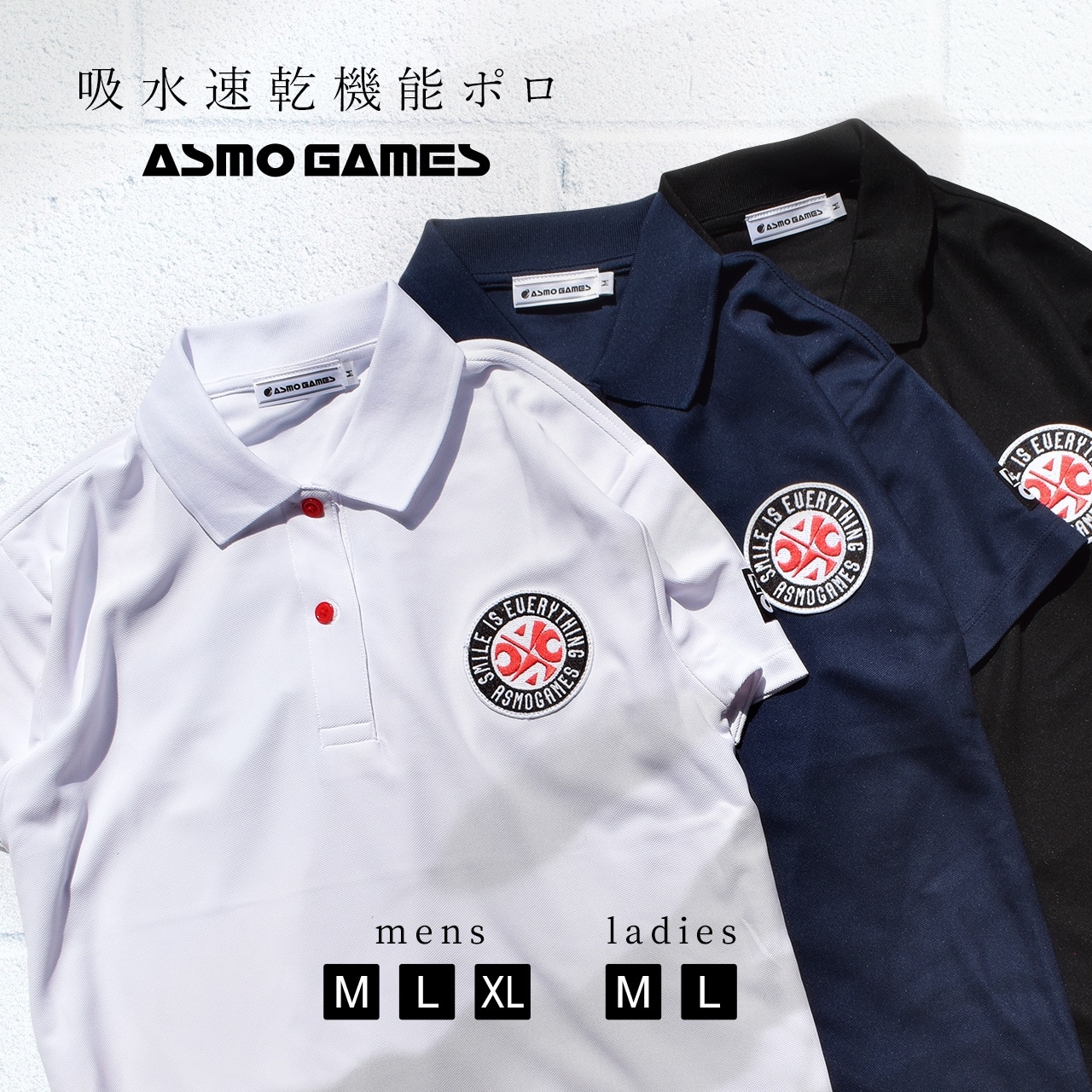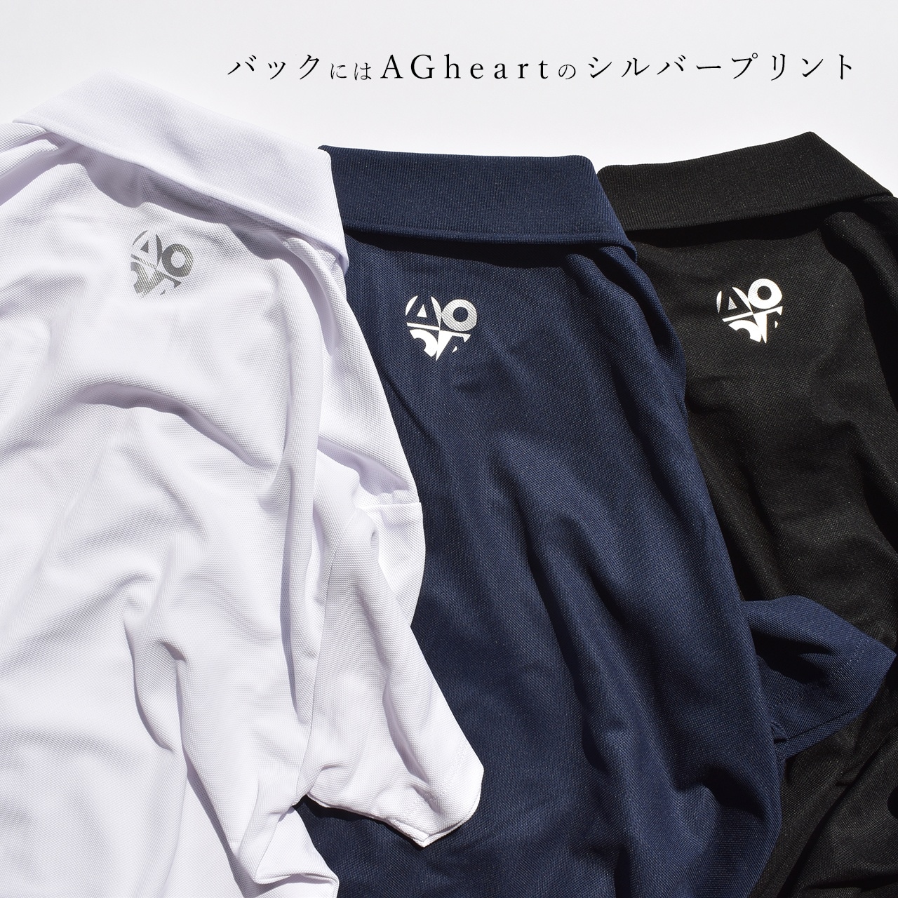 左胸部にASMOGAMESのサークルエンブレムのワッペン、背面にAGheartロゴがさりげなくプリントされた2022サマー新作のポロシャツです。